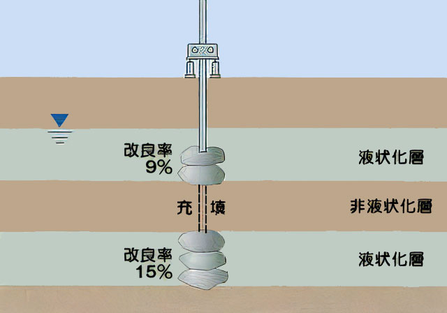 CPGポンプを用いた静的圧入により、無振動、低騒音で地盤を締固めます。 地盤変位や構造物変位が少なく、既設構造物の直下、直近地盤といったこれまで困難といわれたケースに威力を発揮します。